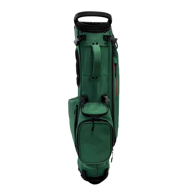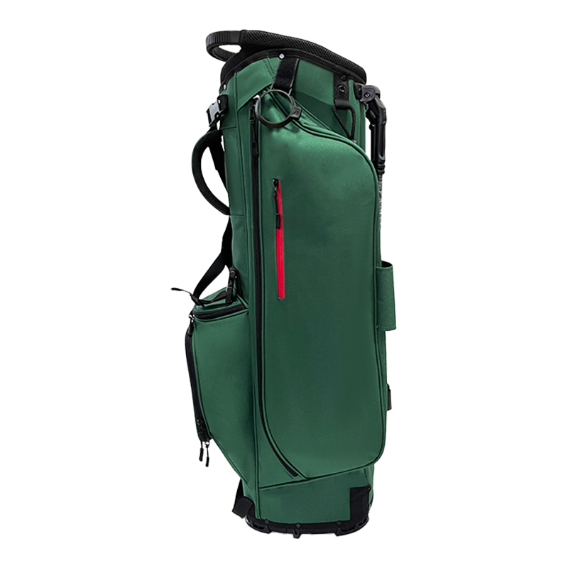 Our Lightweight Deep Green Golf Stand Bag is the ideal combination of design and practicality. Its polyester fabric makes this bag sturdy enough on the course for golfers who value performance and style. Five large club sections and a breathable mesh top keep your clubs organized and ready to go. Red zippers on the side pockets offer a pop, and the multi-pocket design holds all your golfing supplies. Includes rain cover and removable twin shoulder straps for customization. Unexpected weather changes are prepared for with an umbrella holder. Individuals wishing to express themselves on the green may personalize this bag.