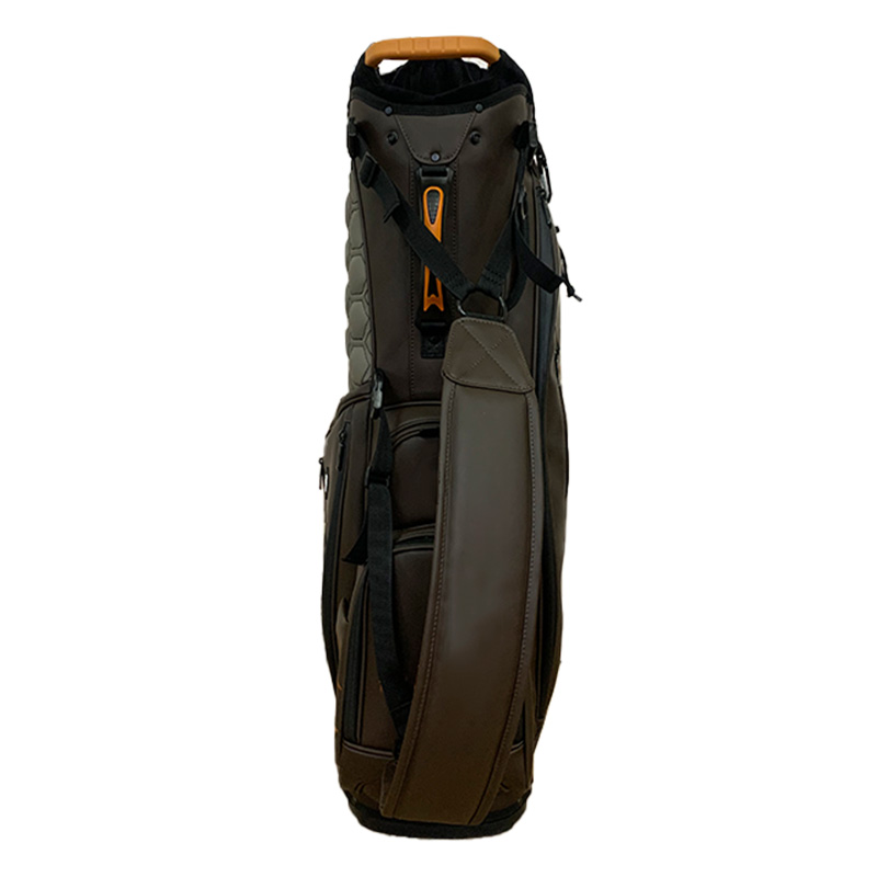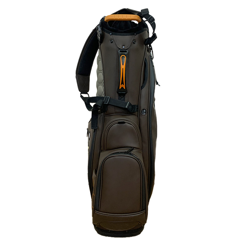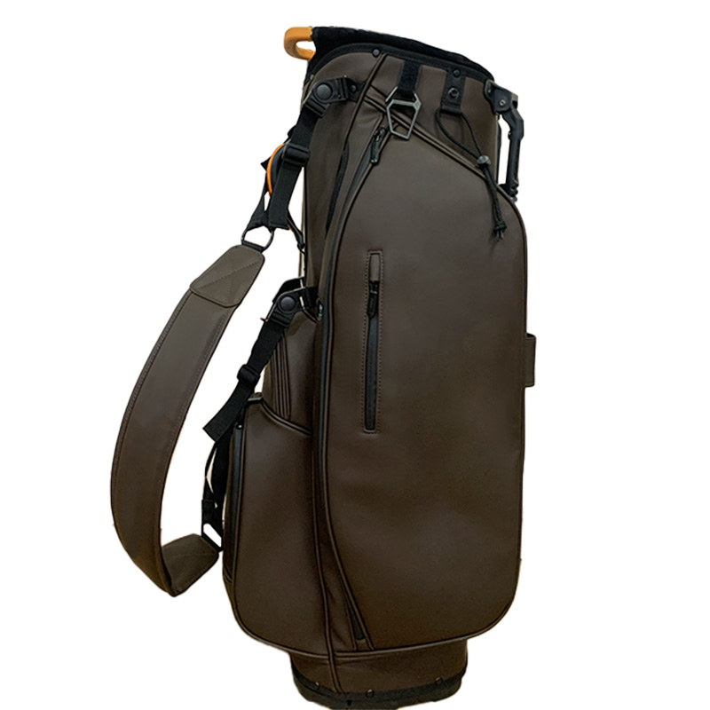 Enhance your golfing experience with our Premium Deep Brown Golf Stand Bag, which is expertly created from high-quality PU leather to ensure longevity and refinement. This sleek bag perfectly mixes design and function, making it an excellent choice for golfers of all ability levels. Its waterproof material protects your gear from rain and dampness, enabling you to play with confidence in any conditions. With 14 roomy club compartments, your clubs will stay organized and accessible, while the beautiful velvet-lined inside will protect them from scratches. The bright orange handles not only provide color but also give ergonomic comfort, making it simple to transport your stuff from hole to hole.
